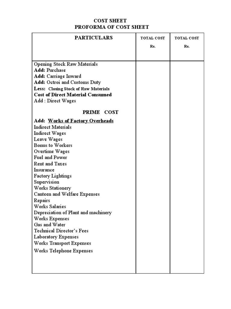 Ideal Cost Sheet Proforma Pdf